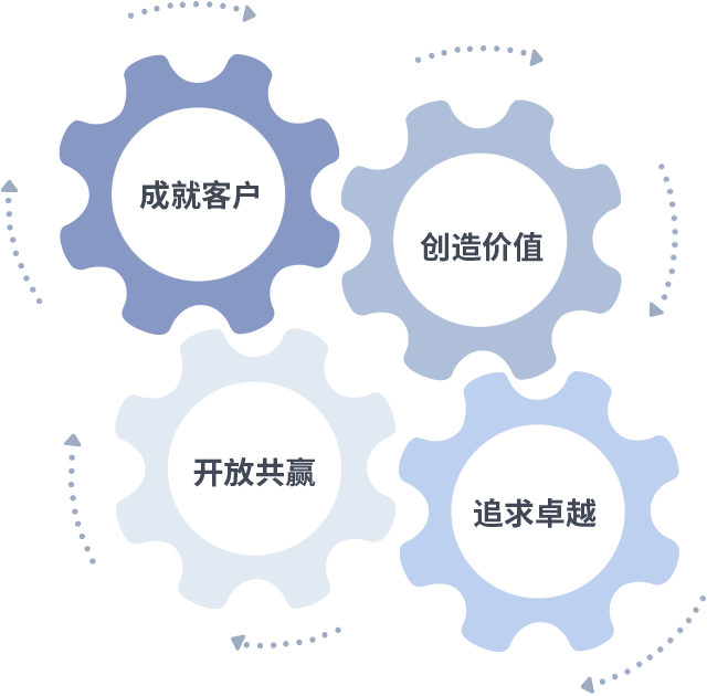 成就客户是一切决策的出发点,,创造价值是衡量所有工作的标准,,追求卓越是我们做事做人的态度,,,,开放共赢是我们的格局也是最终的结果。。。。价值观的齿轮环环相扣,,,,推动着组织里的每个人不断向前。。